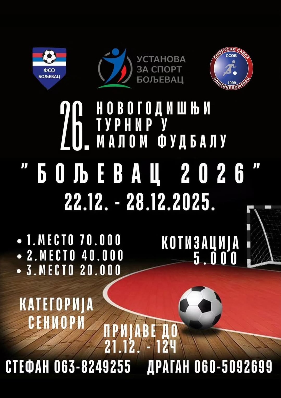 26. НОВОГОДИШЊИ ТУРНИР У МАЛОМ ФУДБАЛУ ЗА КРАЈ ГОДИНЕ У БОЉЕВЦУ, ПРИЈАВЕ ДО 21. ДЕЦЕМБРА