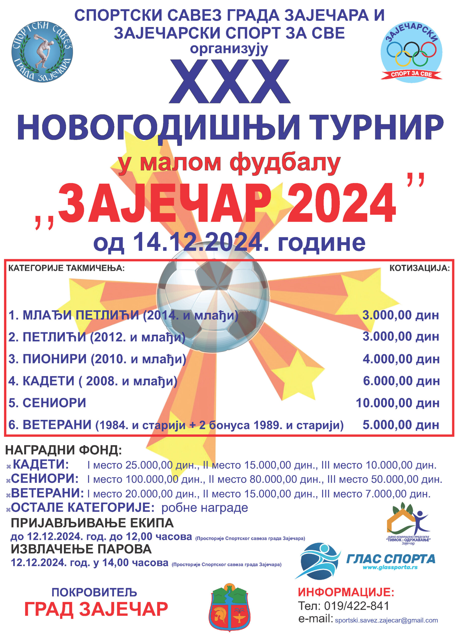 Генерални секретар Спортског савеза града Зајечара Игор Божиновић истакао је да је пријављивање могуће до четвртка 12.децембра до 12 сати у просторијама Спортског савеза града Зајечара. Билтен о турниру биће објављен одмах после извлачења, тако да ће сви учесници бити на време обавештени о сатници и дану играња утакмица.