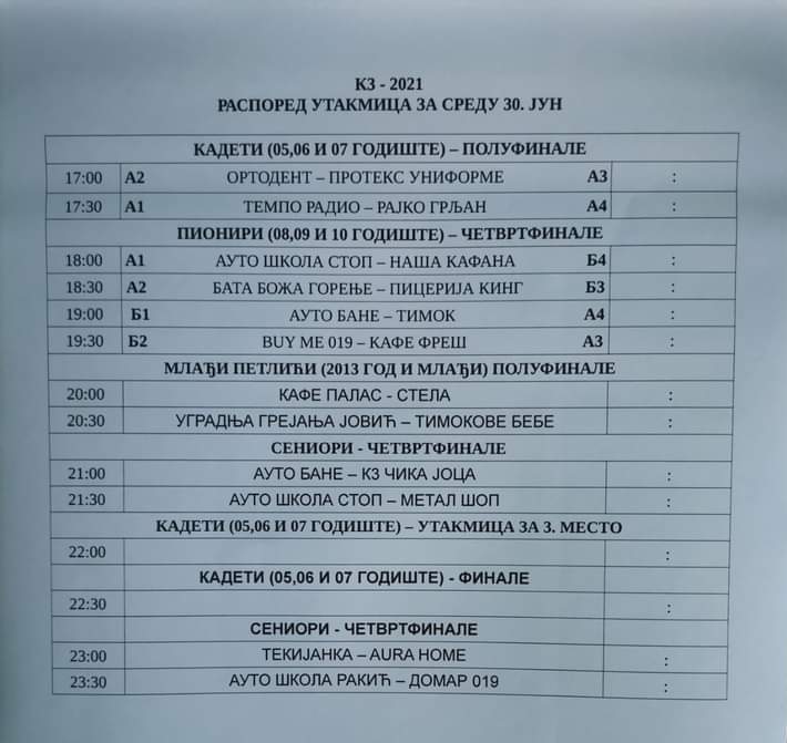 Ево и свих утакмица заказаних за среду 30. јун на Меморијалу „Јоца Михаиловић – К3“: