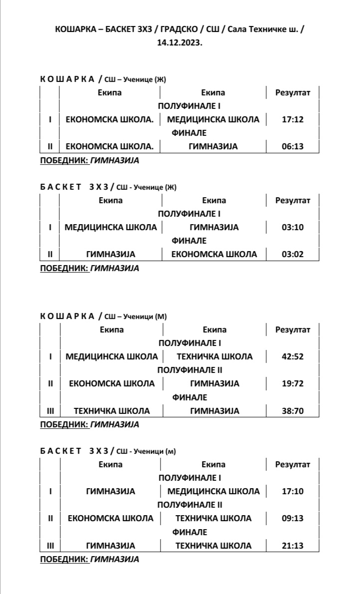 Највише разлога за задовољство имали су ученици и ученице Гимназије, чије су екипе забележиле све четири победе у надметањима са екипама Техничке, Медицинске и Економско-трговинске школе. Нарочито убедљиви били су чланови мушке екипе Гимназије, који су најпре славили у полуфиналу против Економске резултатом 72:19, да би у финалу пао и највећи ривал Техничка школа 70:38. Најнеизвесније је било у финалу такмичења у баскету у конкуренцији девојчица, где су ученице Гмназије славиле после велике борбе против вршњакиња из Економско-трговинске школе резултатом 3:2.