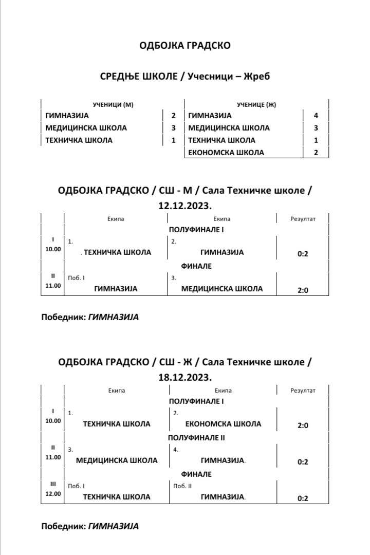 Кренимо редом. Све је почело од надметања ученика средњих школа у одбојци 12. децембра. Гимназија је најпре у полуфиналу надиграла Техничку школу са 2:0, а истоветним резултатом савладала и Медицинску у финалном дуелу.