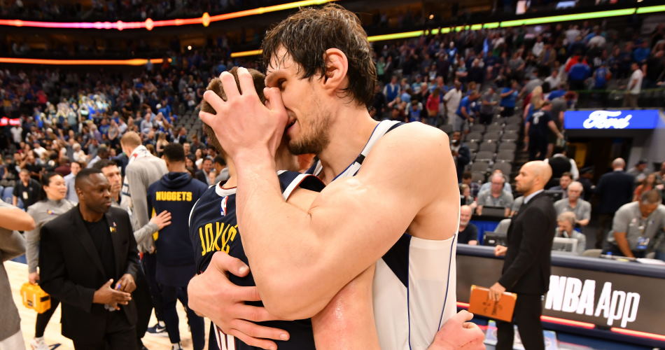 - DALLAS, TX – MARCH 11: Nikola Jokic #15 of the Denver Nuggets hugs Boban Marjanovic #51 of the Dallas Mavericks after the game on March 11, 2020 at the American Airlines Center in Dallas, Texas. NOTE TO USER: User expressly acknowledges and agrees that, by downloading and or using this photograph, User is consenting to the terms and conditions of the Getty Images License Agreement. Mandatory Copyright Notice: Copyright 2020 NBAE (Photo by Glenn James/NBAE via Getty Images)