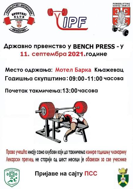 Државно првенство у „Bench press-u“ на програму је у суботу 11. септембра у Књажевцу. Организатори су Пауерлифтинг (Powerlifting) и боди билдинг спортски клуб „Књажевац“ и Спортски савез Књажевца, уз покровитељство локалне самоуправе.