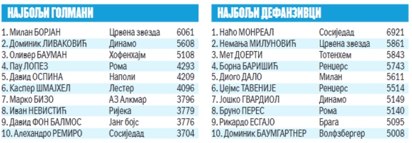 БОРЈАН НАЈБОЉИ ГОЛМАН ЛИГЕ ЕВРОПЕ, МИЛУНОВИЋ ДРУГИ ДЕФАНЗИВАЦ ТАКМИЧЕЊА