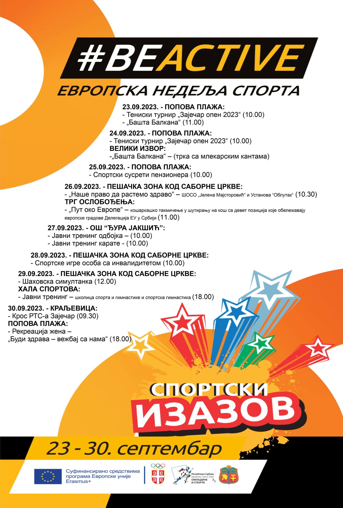 Спортски савез града Зајечара је у договору са локалном самоуправом јавне тренинге у одбојци и каратеу који су према програму „Спортског изазова“ били у плану за среду 27. септембар пребацио за петак 29. септембар, када ће бити изведени на теренима Основне школе „Ђура Јакшић“ у периоду од 10 до 12 сати.