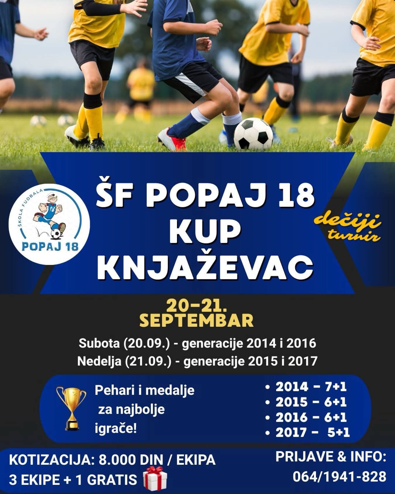 Из Школе фудбала „Попај 18“ позивају све заинтересоване да се пријаве за учешће. Најбоље тимове и појединце очекују пехари и медаље, а котизација износи 8.000 динара по екипи.