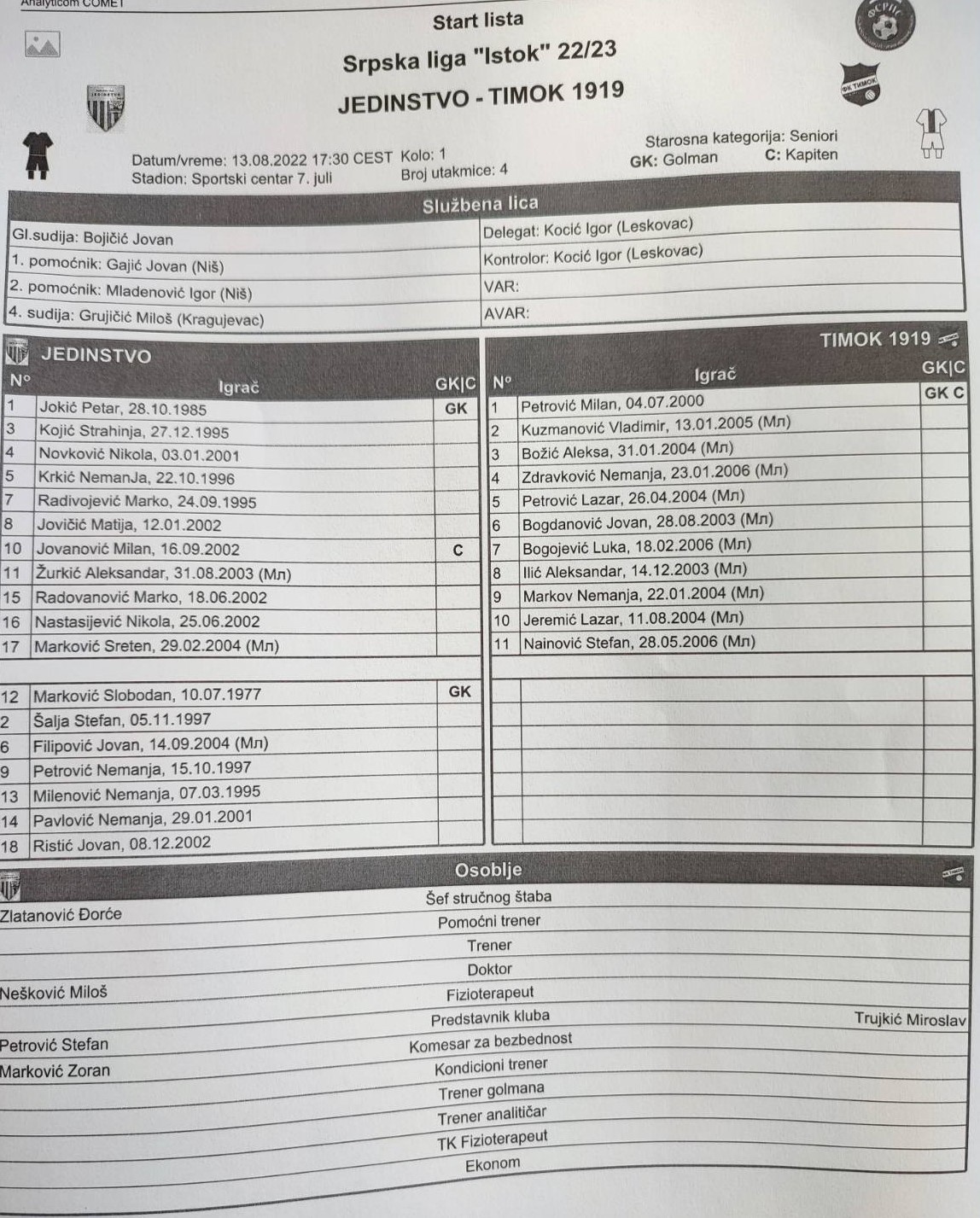 Вреди запамтити ове дечаке, били су ту за Тимок у заиста тешкој ситуацији, а предвођени помоћником шефа струке Мирославом Трујкићем пружили су свој максимум и нису дозволили да се образ гостујућег клуба окаља. Вреди ипак истаћи да су представници ФК Тимок 1919 покушали да помере сусрет за први слободан термин, али им тако нешто није одобрено од стране ФСРИС.