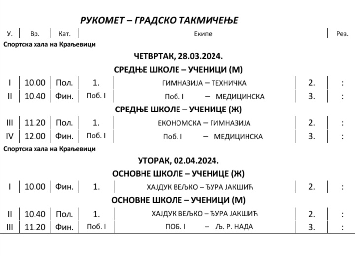 Нема паузе што се тиче школског спорта, па нас тако већ у четвртак 28. марта у хали спортова на Краљевици очекује градско такмичење у рукомету за ученике и ученице средњих школа, док је 2. април резервисан за ђаке зајечарских основних школа.