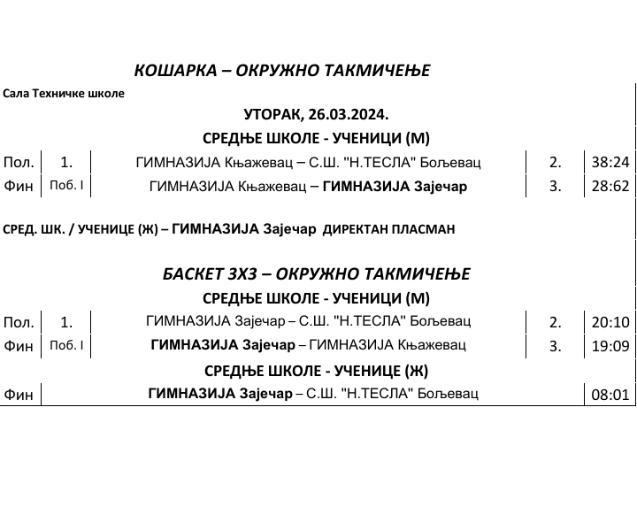 Ученици зајечарске Гимназије имају највише разлога за задовољство након Окружног такмичења у кошарци и баскету 3×3, пошто су све четири екипе обезбедиле пласман у даљи круг надметања. Организатор такмичења одржаног у сали Техничке школе у уторак 26. марта био је Зајечарски савез за школски спорт (ЗШС), а мушке и женске екипе Гимназије су на доминантан начин освојиле прва места у конкуренцији школа из Књажевца и Бољевца.