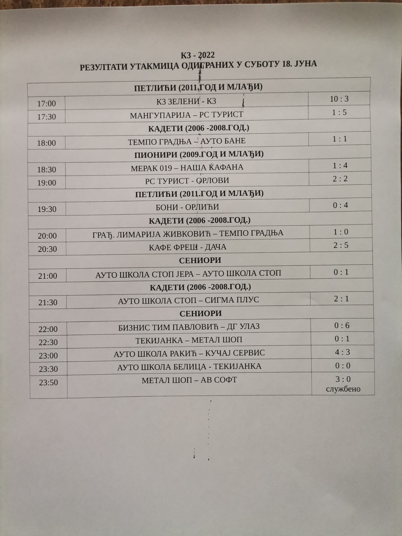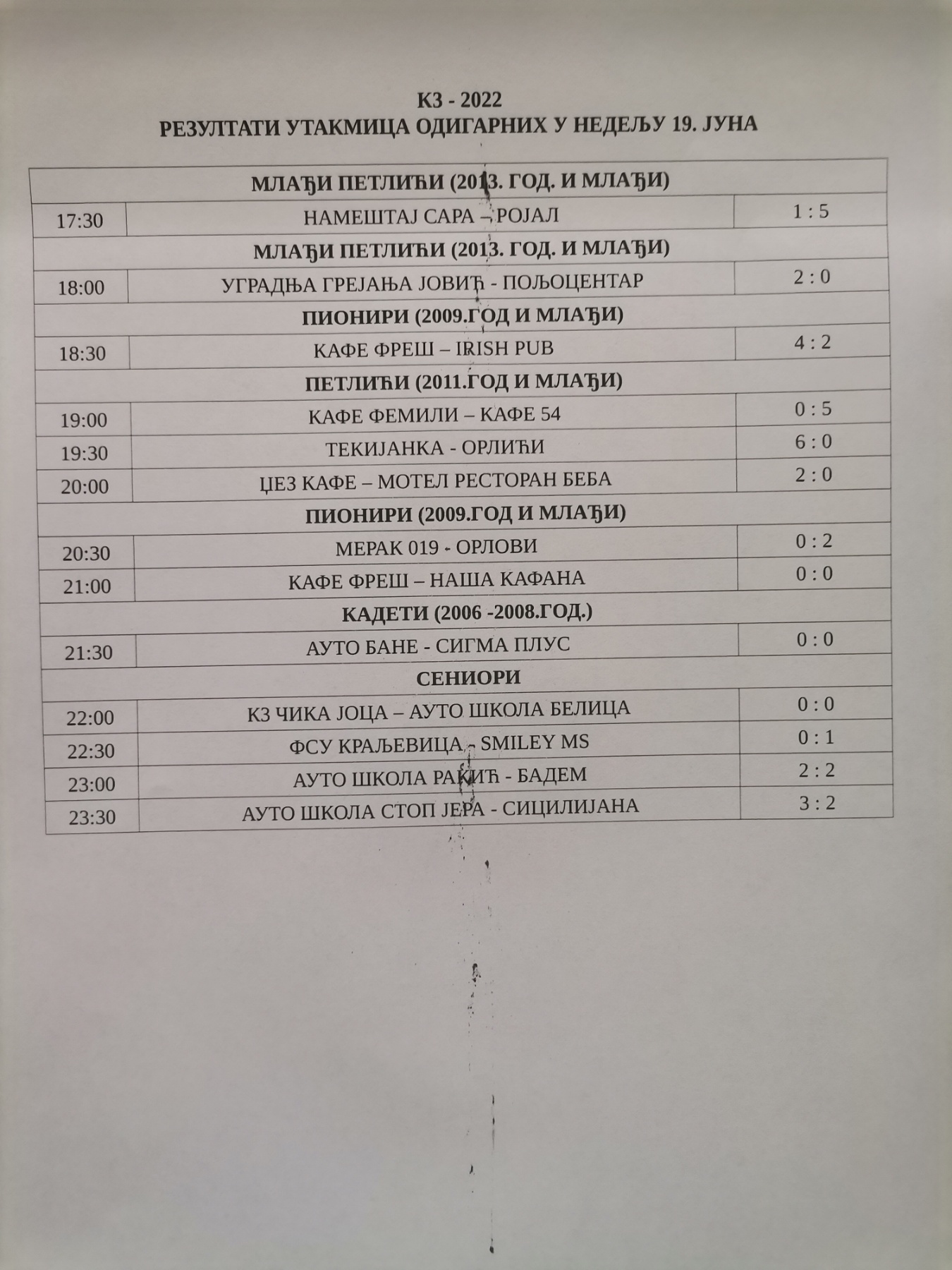 Постигнути су следећи резултати у мечевима одиграним у суботу 18. и недељу 19. јуна.