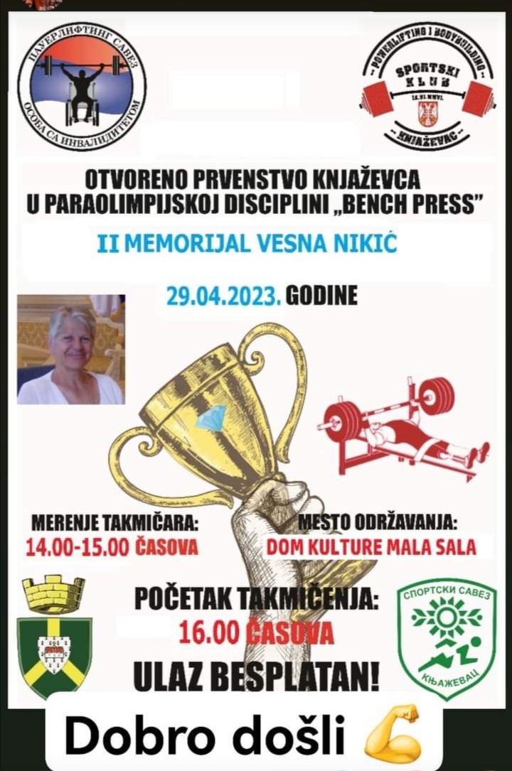 Други Меморијал „Весна Никић“ у параолимпијској дисциплини “bench press” на програму је у суботу 29. априла у Књажевцу. Организатори такмичења су Пауерлифтинг и бодибилдинг спортски клуб „Књажевац“ и Пауерлифтинг савез особа са инвалидитетом, под покровитељством локалне самоуправе и подршку Спортског савеза Kњажевца.