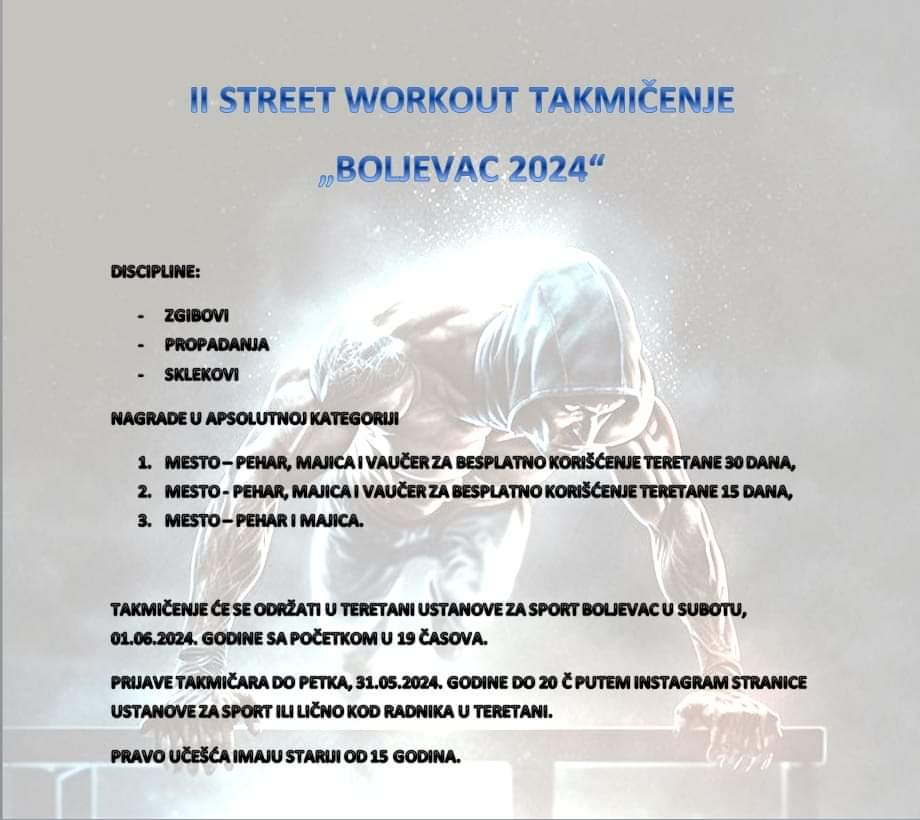 Спортски савез општине Бољевац и Установа за спорт Бољевац организују друго по реду „STREET WORKOUT“ такмичење у суботу 1. јуна. Пријаве такмичара могуће су до петка 31. маја до 20 сати.