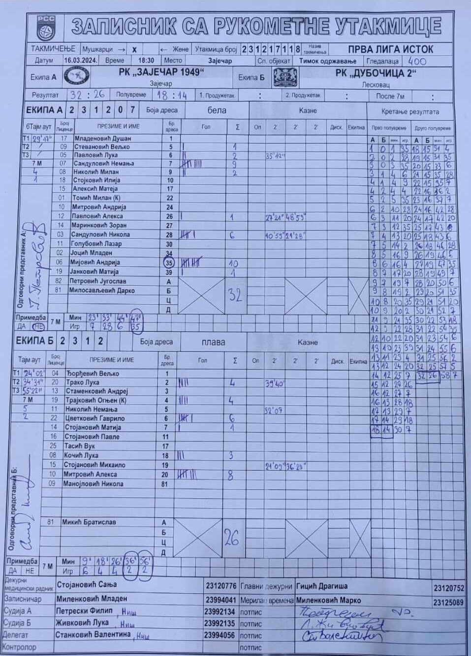 Најефикаснији играч сусрета био је Зајечарац Андрија Мијовић са 10 погодака, док је гол мање забележио Немања Сандуловић, а Никола Сандуловић додао 6. Ево и извештаја са суботњег сусрета: