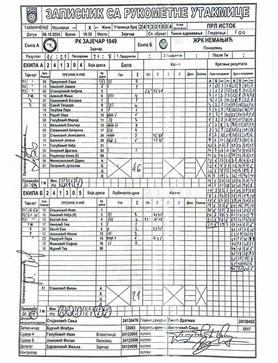 Рукометашице Зајечара декласирале су на отварању сезоне у Првој лиги „Исток“ екипу „Немањића“ резултатом 46:21 (21:8). Зајечарке ниједног момента нису допустиле Пожаревљанкама да помисле да имају шансу у хали спортова на Краљевици и апсолутно заслужено стигле до два бода у првом првенственом колу.