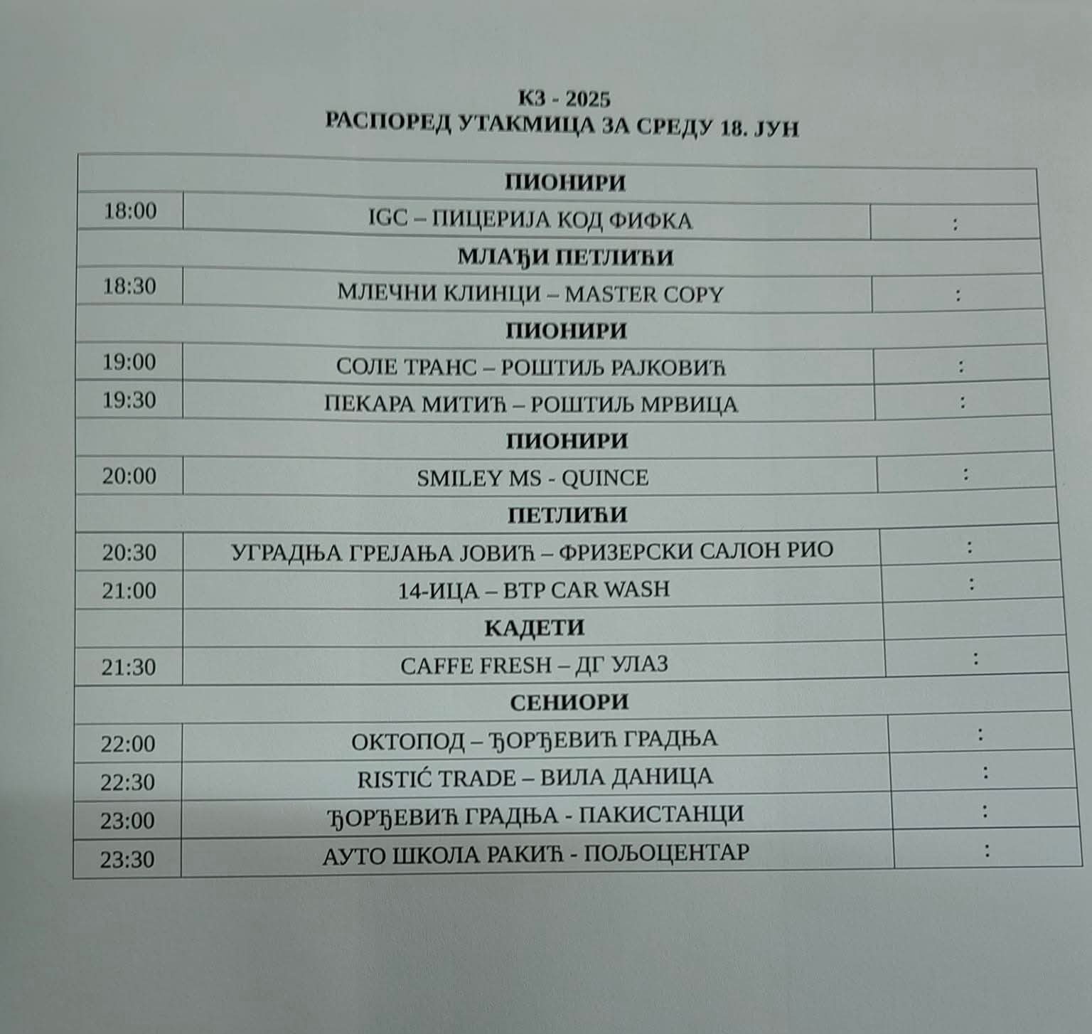 Среда 18. јун резервисана је за 3. дан надметања на петопарцу у Котлујевцу, прва утакмица почиње у 18 сати, а ево и комплетног програма који очекује све посетиоце: