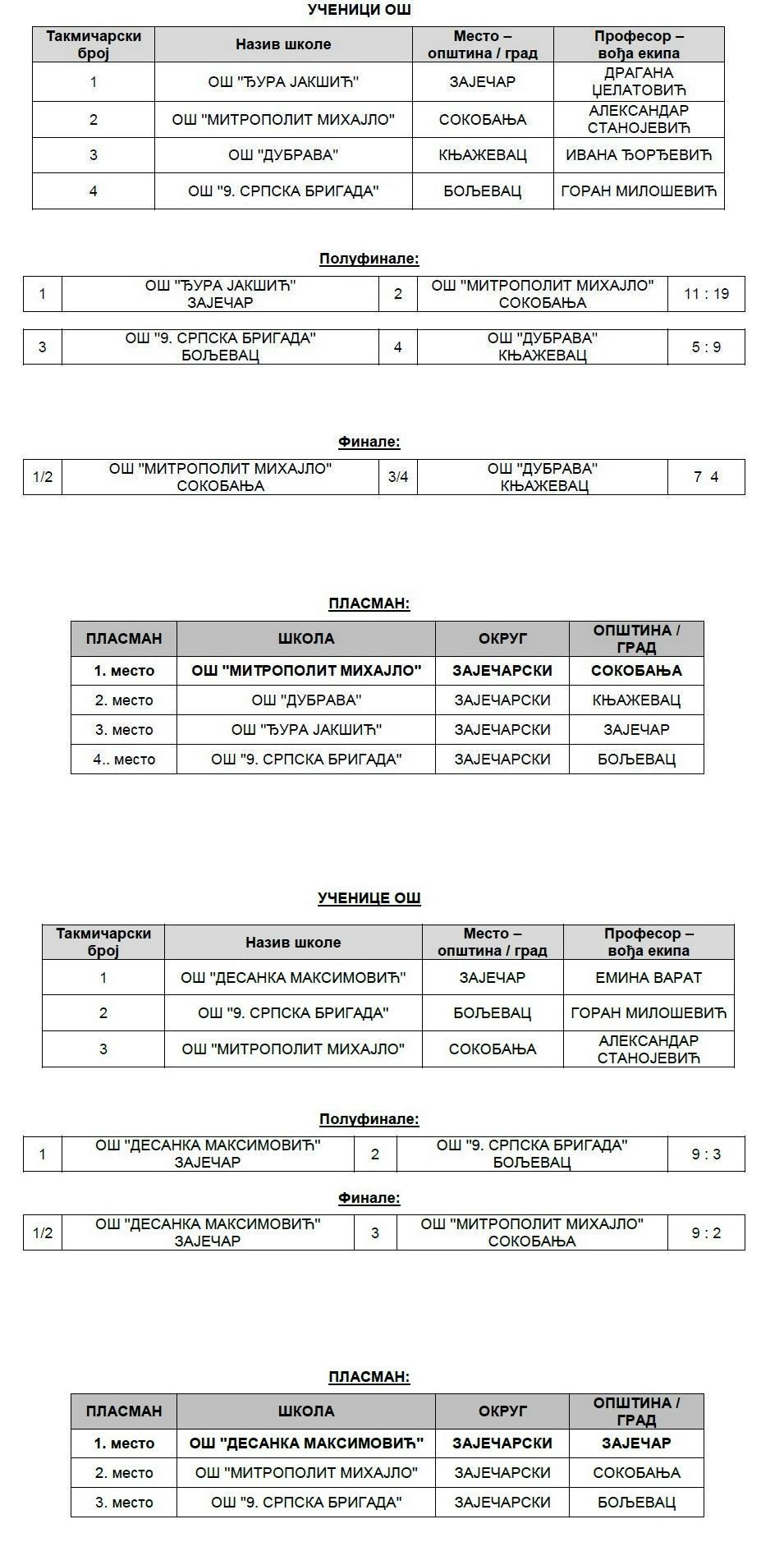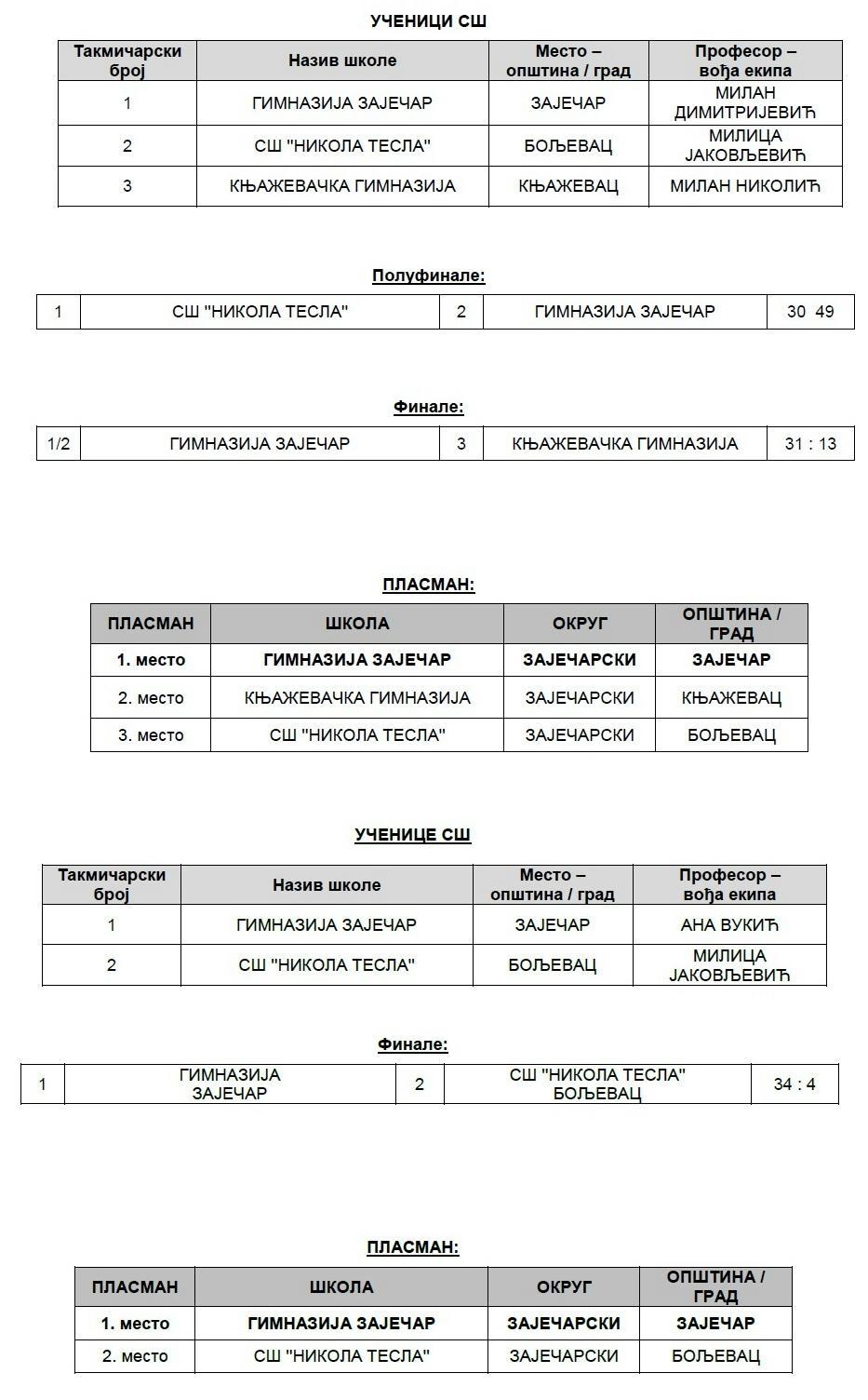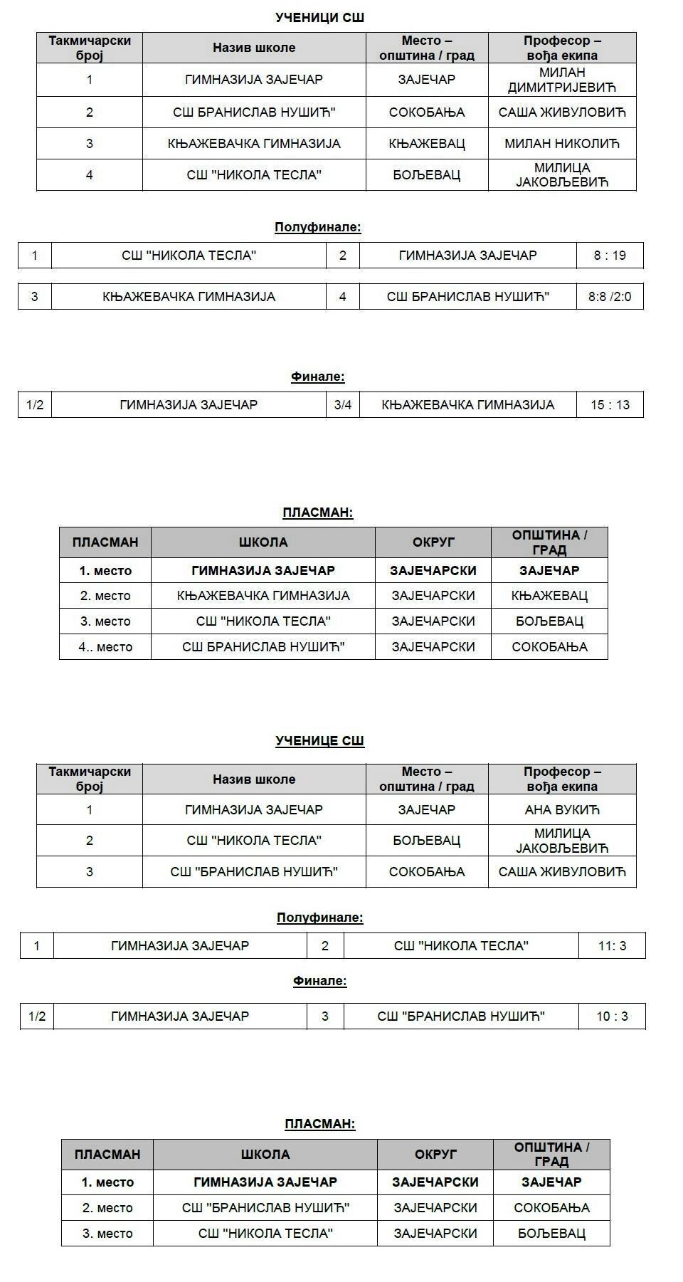 Три дана касније виђена је потпуна доминација ученика и ученица зајечарске Гимназије, који су славили на доминантан начин и обезбедили пласман у даљи круг такмичења. Мушку и женску екипу Гимназије водили су професори Милан Димитријевић и Ана Вукић.