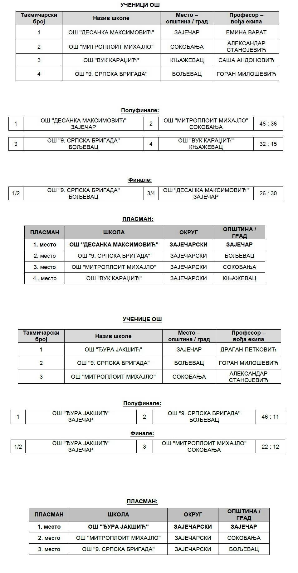 ЕКИПЕ ЗАЈЕЧАРСКИХ ШКОЛА НАЈБОЉЕ НА ОКРУЖНОМ ТАКМИЧЕЊУ У КОШАРЦИ И БАСКЕТУ У БОЉЕВЦУ