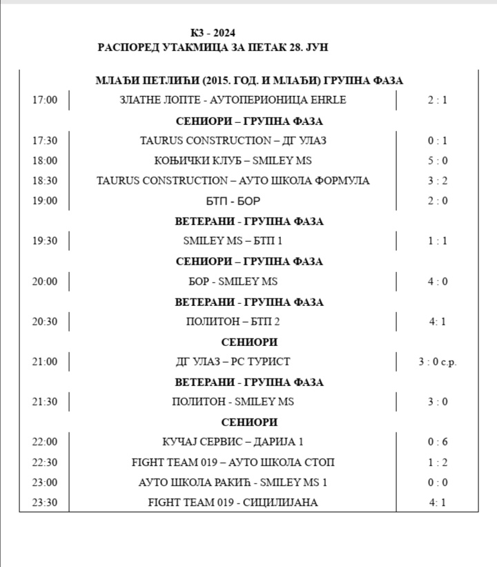 Програм Меморијалног турнира у малом фудбалу „Јоца Михаиловић – К3“ за 29. јун: