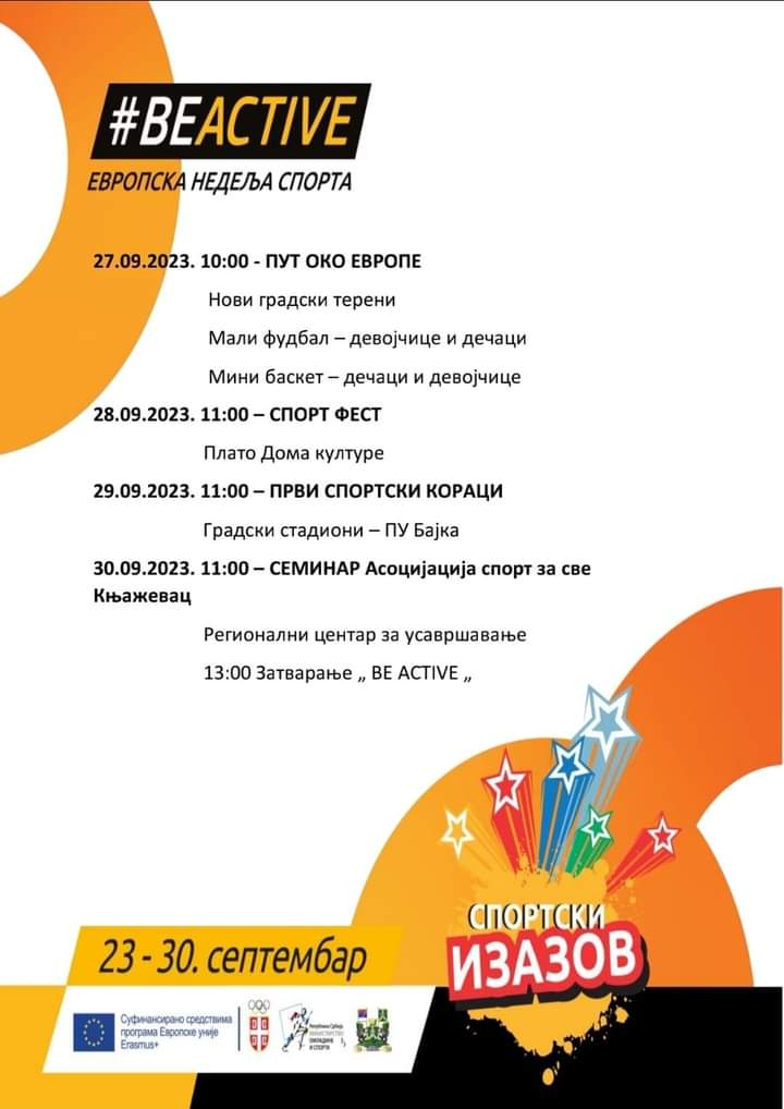 Велики број занимљивих активности очекују пре свега најмлађе Књажевчане, али и све заинтересоване грађане, који ће последње недеље септембра моћи да уживају у бројним спортским дисциплинама. Јавни тренинзи биће извођени на различитим локацијама, почев од платоа Дома културе, преко хале ОШ „Каплар“, до базена „Бањица“ и нових градских терена до стадиона.
