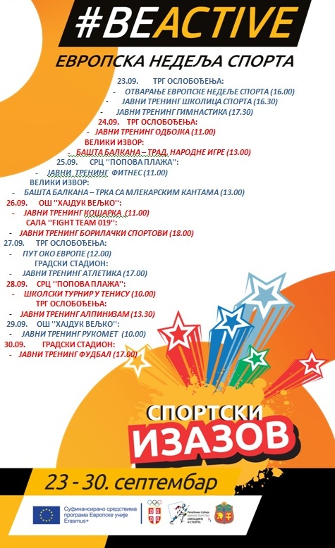 Током целе последње недеље септембра, биће организован низ спортских догађаја у нашој земљи као што су „Спортски изазов“, „Пут око Европе“ у извођењу ЕУ делегације у Србији и „BeActive ноћ“, а поред Зајечара, домаћини Европске недеље спорта биће и Аранђеловац, Пожаревац, Сомбор, Бор, Kњажевац, Пирот, Зрењанијн, Панчево и Београд.