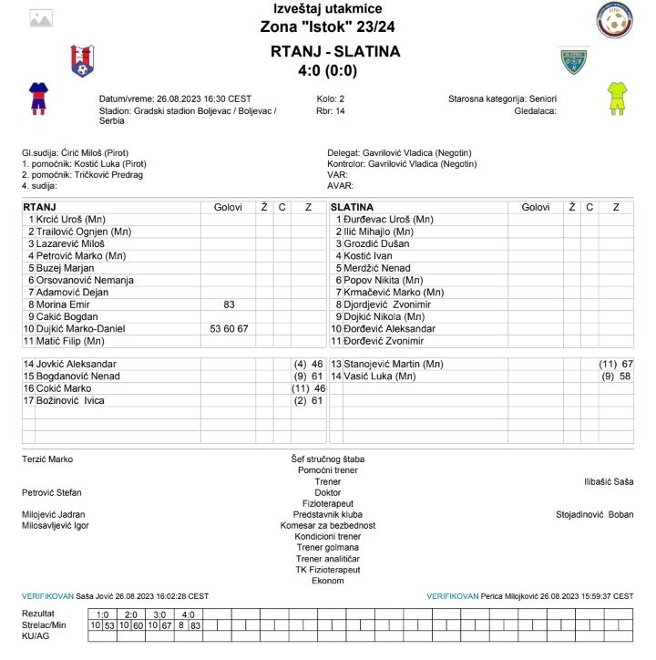 Фудбалери Ртња савладали су екипу ОФК Слатине резултатом 4:0 у 2. колу Зоне „Исток“. Бољевчани су на тај начин остварили премијерни тријумф, пошто су недељу дана раније несрећно поражени у Неготину. Голеада против Хајдук Вељка у којој су на старту сезоне допустили ривалу да за 20 минута надокнади два гола минуса и од 1:3 стигне до победе, била је довољна опомена изабраницима тренера Терзића да не дозволе ново непријатно изненађење.