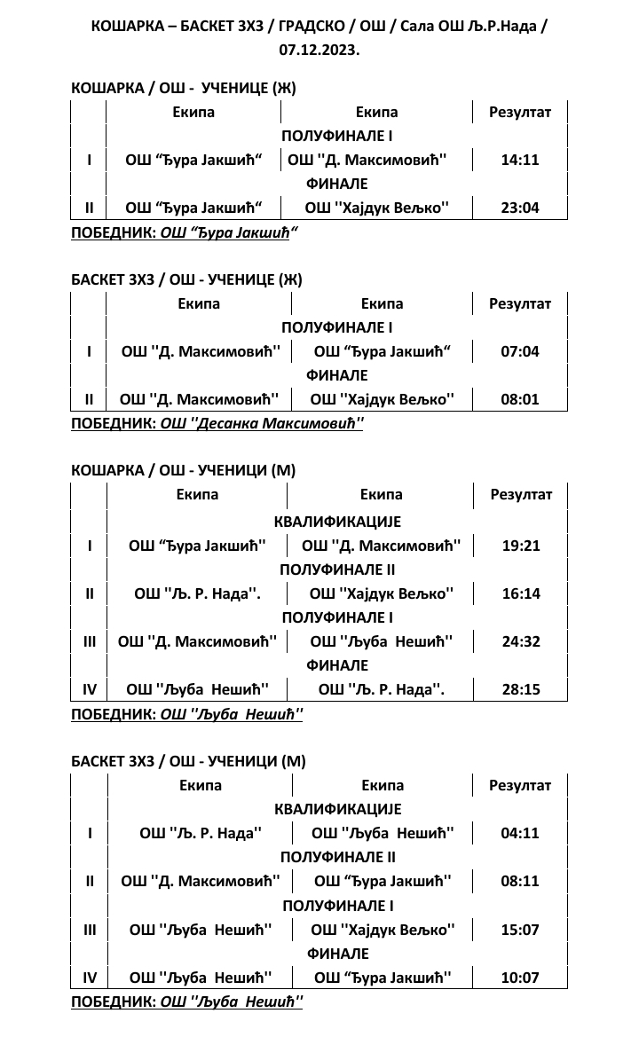Ловорике су понеле ученице Основне школе „Ђура Јакшић“ у женској и њихови вршњаци из ОШ „Љуба Нешић“ у конкуренцији ученика. Што се баскета тиче, екипа Основне школе „Десанка Максимовић“ тријумфовала је у категорији ученица, док је победу у конкуренцији ученика однела екипа ОШ „Љуба Нешић“.