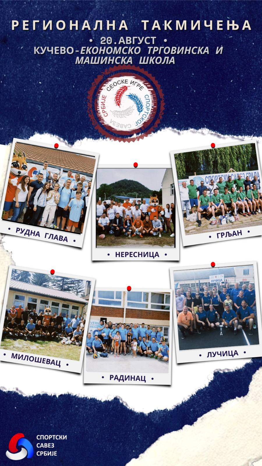 Регионално такмичење Сеоских игара Спортског савеза Србије на програму је у суботу 20. августа у Кучеву. Зајечар ће на овој престижној рекреативној манифестацији представљати четвороструки шампион Грљан, а поред највећег зајечарског села, на такмичењу у Браничевском округу учествоваће домаћа Нересница као шампион Кучева, Рудна Глава – Мајданпек, Милошевац – Велика Плана, Радинац – Смедерево и Лучица – Пожаревац.