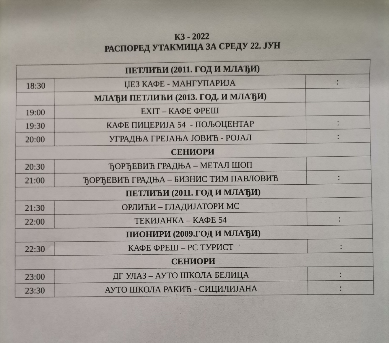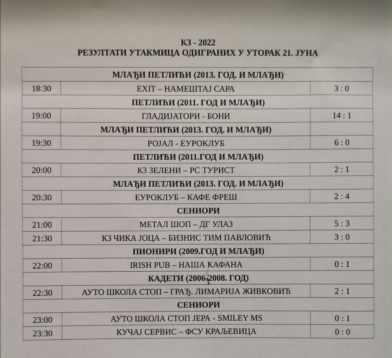 Осам дана фудбала је иза нас на турниру у зајечарском насељу Кључ III, а сигурно је да нас чека још много узбуђења на Меморијалу „Јоца Михаиловић – К3“. Све у свему велики број одличних утакмица, атрактивних потеза и ефектних голова виђено је и у уторак 21. јуна, а постигнути су следећи резултати: