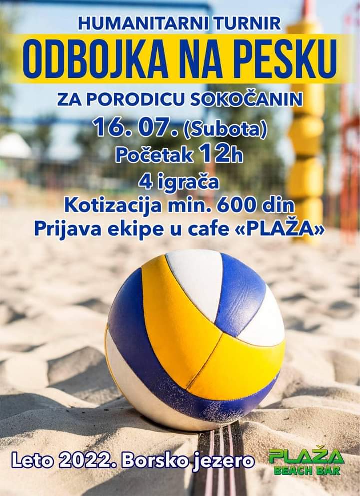 Традиционални хуманитарни турнир у одбојци на песку на програму је у суботу на Борском језеру. Сав приход са турнира, који ће бити организован 16. јула са почетком у 12 сати, биће усмерен за помоћ породици Сокочанин.