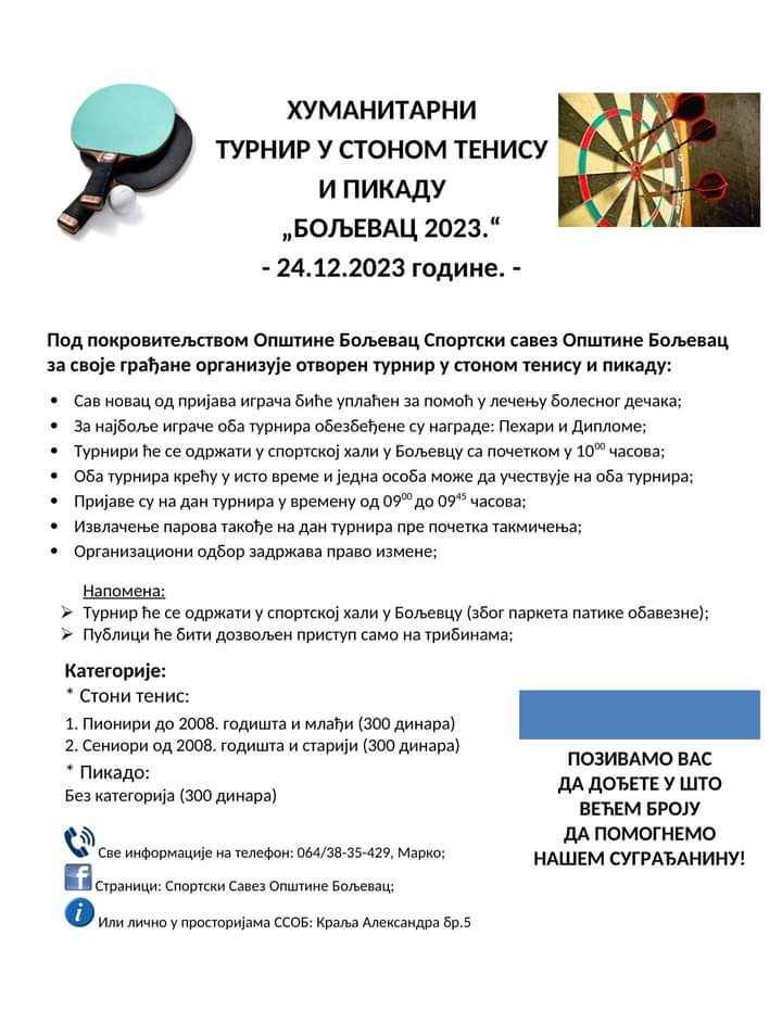 Хуманитарни турнир у стоном тенису и пикаду „БОЉЕВАЦ 2023.“ на програму је у недељу 24.децембра у спортској хали. Организатор такмичења отвореног типа је Спортски савез општине Бољевац уз покровитељство локалне самоуправе.