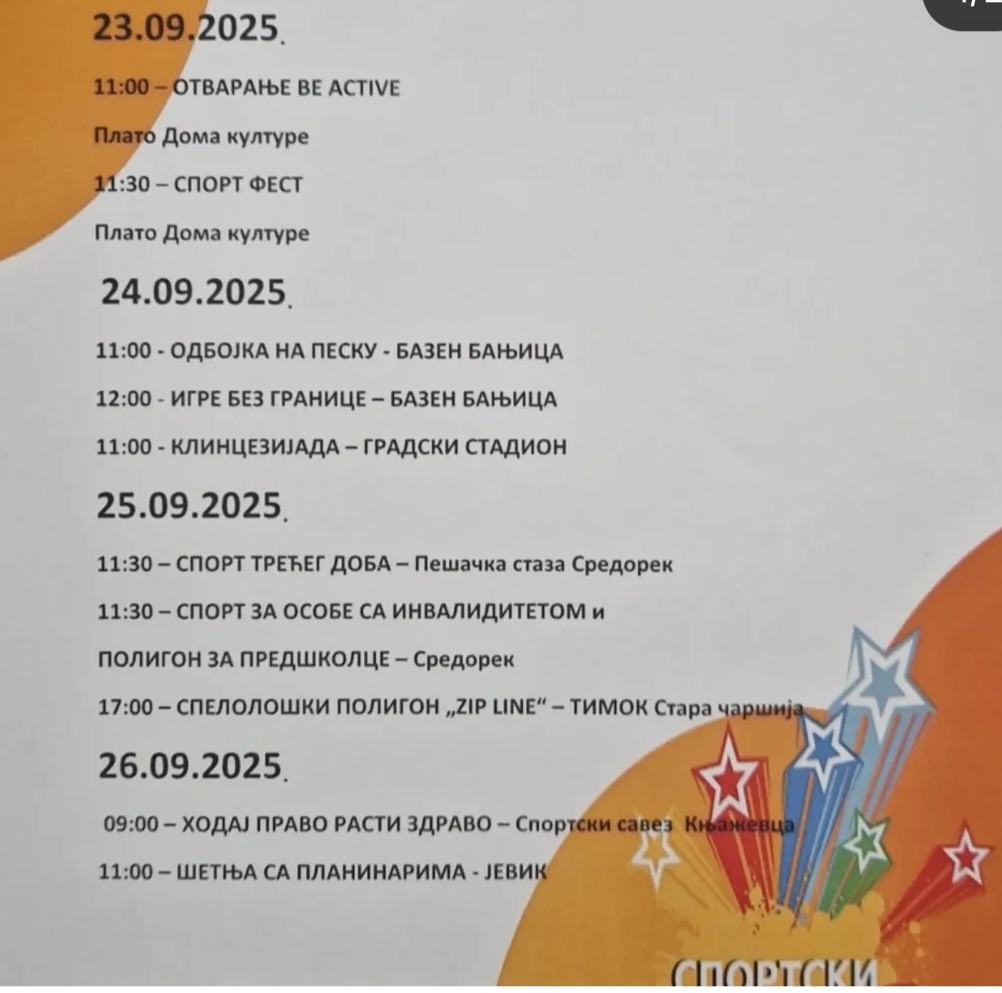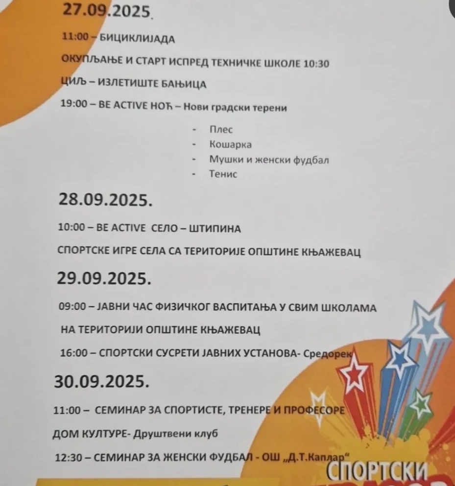 Велики број занимљивих активности очекују пре свега најмлађе Књажевчане, али и све заинтересоване грађане, који ће последње недеље септембра моћи да уживају у бројним спортским дисциплинама. Јавни тренинзи биће извођени на различитим локацијама, почев од платоа Дома културе, преко хале ОШ „Каплар“, до базена „Бањица“ и нових градских терена до стадиона.
