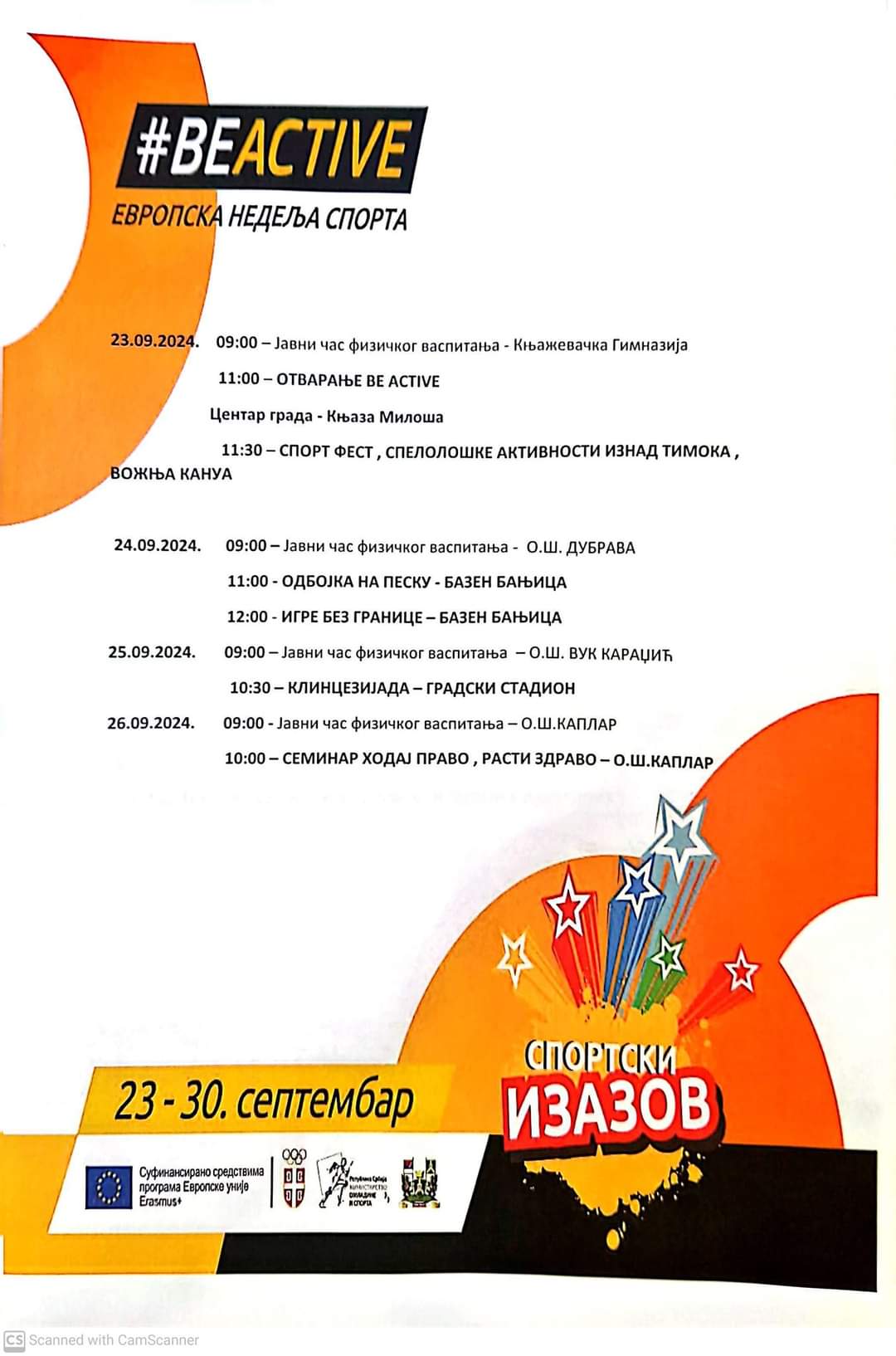Велики број занимљивих активности очекују пре свега најмлађе Књажевчане, али и све заинтересоване грађане, који ће последње недеље септембра моћи да уживају у бројним спортским дисциплинама. Јавни тренинзи биће извођени на различитим локацијама, почев од платоа Дома културе, преко основних и средњих школа, до базена „Бањица“ и терена на различитим локацијама до градског стадиона.