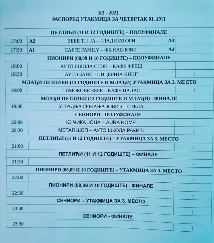Програм последњег дана турнира у Котлујевцу почиње од 17 сати, а публика ће моћи да ужива у мечевима одлуке у конкуренцији млађих петлића, петлића, пионира, као и сениора, где нас очекују како полуфинални окршаји, тако и утакмица за 3. место и финале, када ћемо коначно сазнати ко ће кући однети вредне награде.