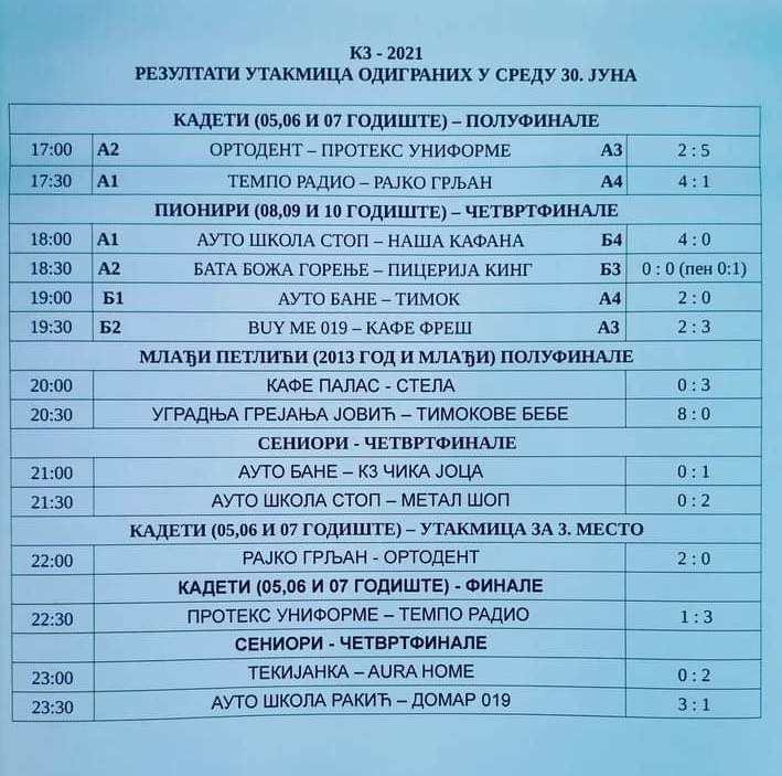 Претпоследњи дан Меморијалног турнира у малом фудбалу „Јоца Михаиловић – К3“ донео је и првог победника и овогодишњег освајача. „Темпо Радио“, дечаци који већ годинама играју у истом саставу, стигли су до нове титуле у кадетској конкуренцији након што су у финалу надиграли „Протекс униформе“ резултатом 3:1. Треће место припало је екипи „Рајко“ из Грљана која је са 2:0 славила против „Ортодента“.