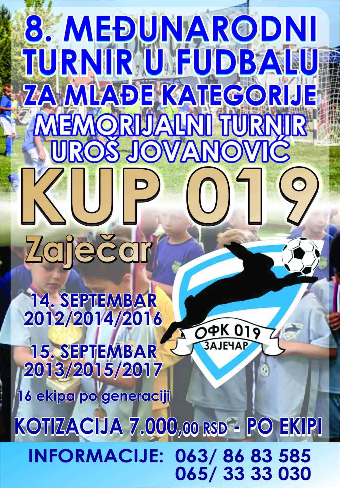 Међународни турнир у фудбалу „Куп 019“ на програму је предстојећег викенда у Зајечару на теренима ОФК 019 на Краљевици, бившем стадиону „Путева“. Осми по реду Меморијални турнир „Урош Јовановић“ окупиће у два дана такмичења, 14. и 15. септембра 96 екипа у шест узрасних категорија.