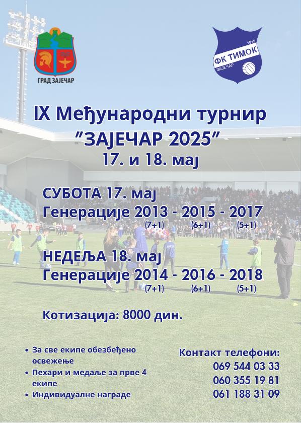 Фудбалски клуб Тимок организоваће девети по реду Међународни турнир „Зајечар 2025“, 17. и 18. маја на градском стадиону на Краљевици, а право учешћа имају играчи рођени од 2013. до 2018. године. Екипе ће наступити у шест узрасних категорија, од 7 до 12 година и то тако што ће 2013., 2015. и 2017. годиште наступити првог дана турнира, док ће другог дана снаге одмерити играчи рођени 2014., 2016. и 2018. године.