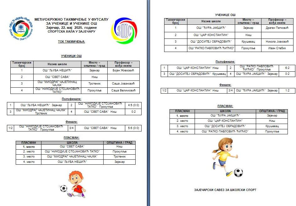 Основна школа „Ђура Јакшић“ из Зајечара учествоваће на Државном такмичењу у футсалу, које је на програму од 26. до 30. маја у Спортском кампу „Караташ“ код Кладова. „Глас спорта“ испратио је комплетан програм Међуокружног такмичења и у наставку доносимо све резултате: