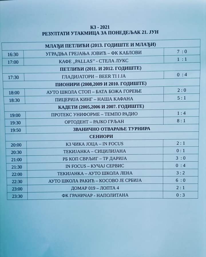 Првог дана игране су утакмице у свих пет узрасних категорија, а постигнути су следећи резултати: