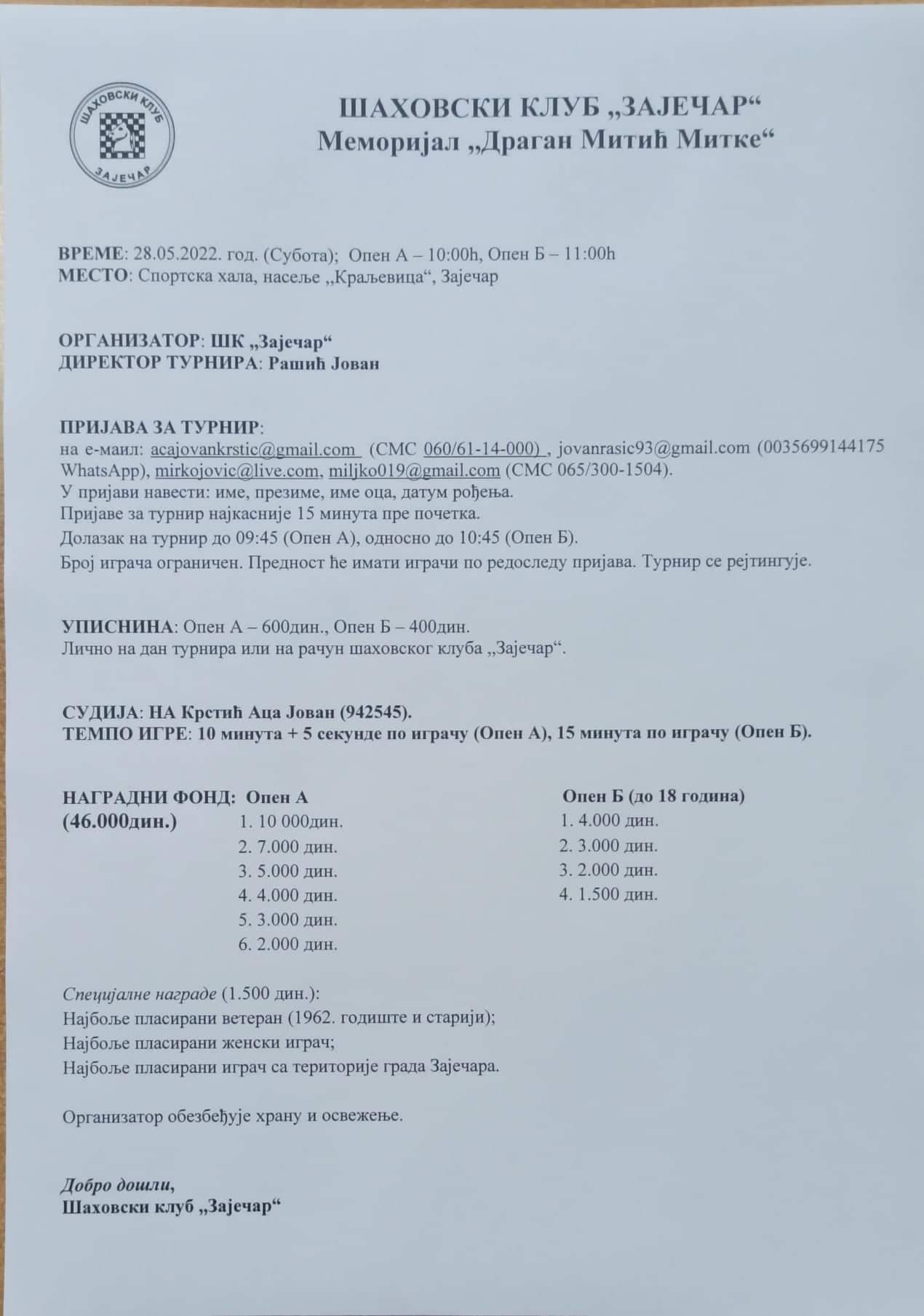 Меморијал „Драган Митић Митке“, посвећен дугогодишњем играчу и капитену Шаховског клуба „Зајечар“ на програму је у суботу 28. маја у хали спортова на Краљевици. Први по реду Меморијални турнир окупиће 70 учесника на Опен А и 20 омладинаца до 18 година на Опен Б делу такмичења.