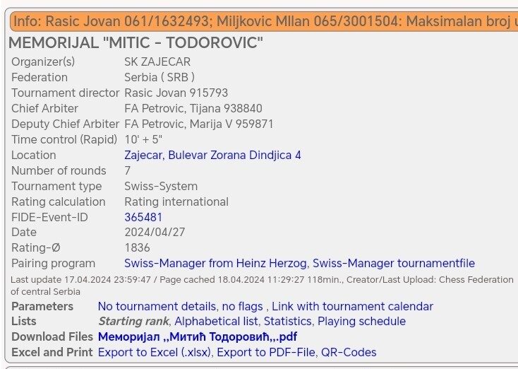 МЕМОРИЈАЛНИ ТУРНИР У ШАХУ „МИТИЋ-ТОДОРОВИЋ“ У ЗАЈЕЧАРУ 27. АПРИЛА