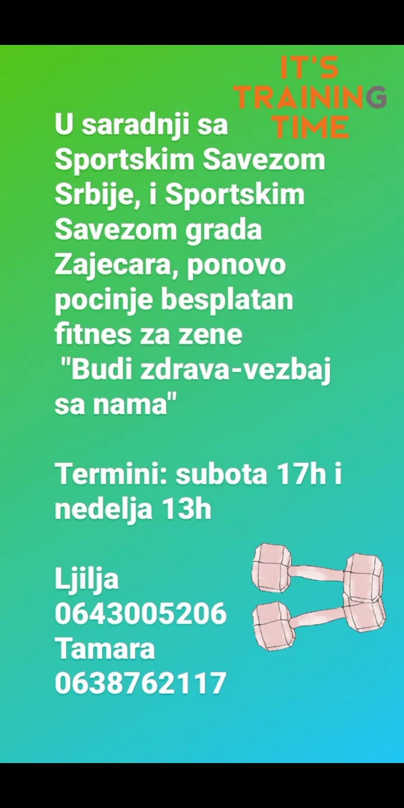 Акција бесплатне рекреације за жене Спортског савеза Србије под називом “Буди здрава – вежбај са нама”, ушла је у своју другу фазу рада у Зајечару. Тренинге још од септембра 2020. године воде Тамара Николић и Љиљана Субић, лиценцирани фитнес тренери, које су успешно прошле обуку у оквиру акције “српске куће спорта”.