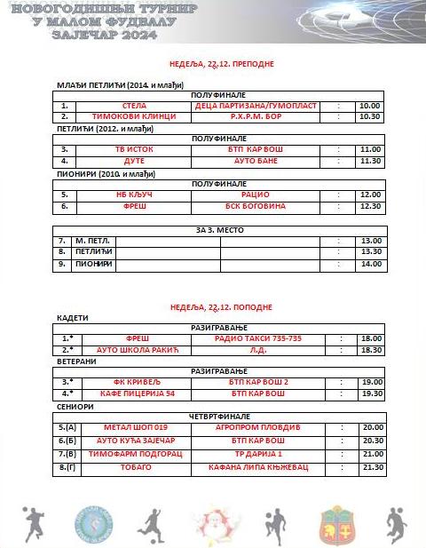 Најава утакмица на Новогодишњем турниру у малом фудбалу „Зајечар 2024“ у хали спортова на Краљевици за 22. децембар: