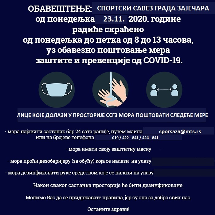 О свим даљим променама у начину рада Спортског савеза града Зајечара, јавност ће бити благовремено обавештена, наводи се у допису зајечарске „куће спорта“.