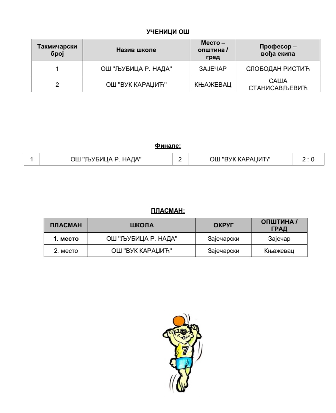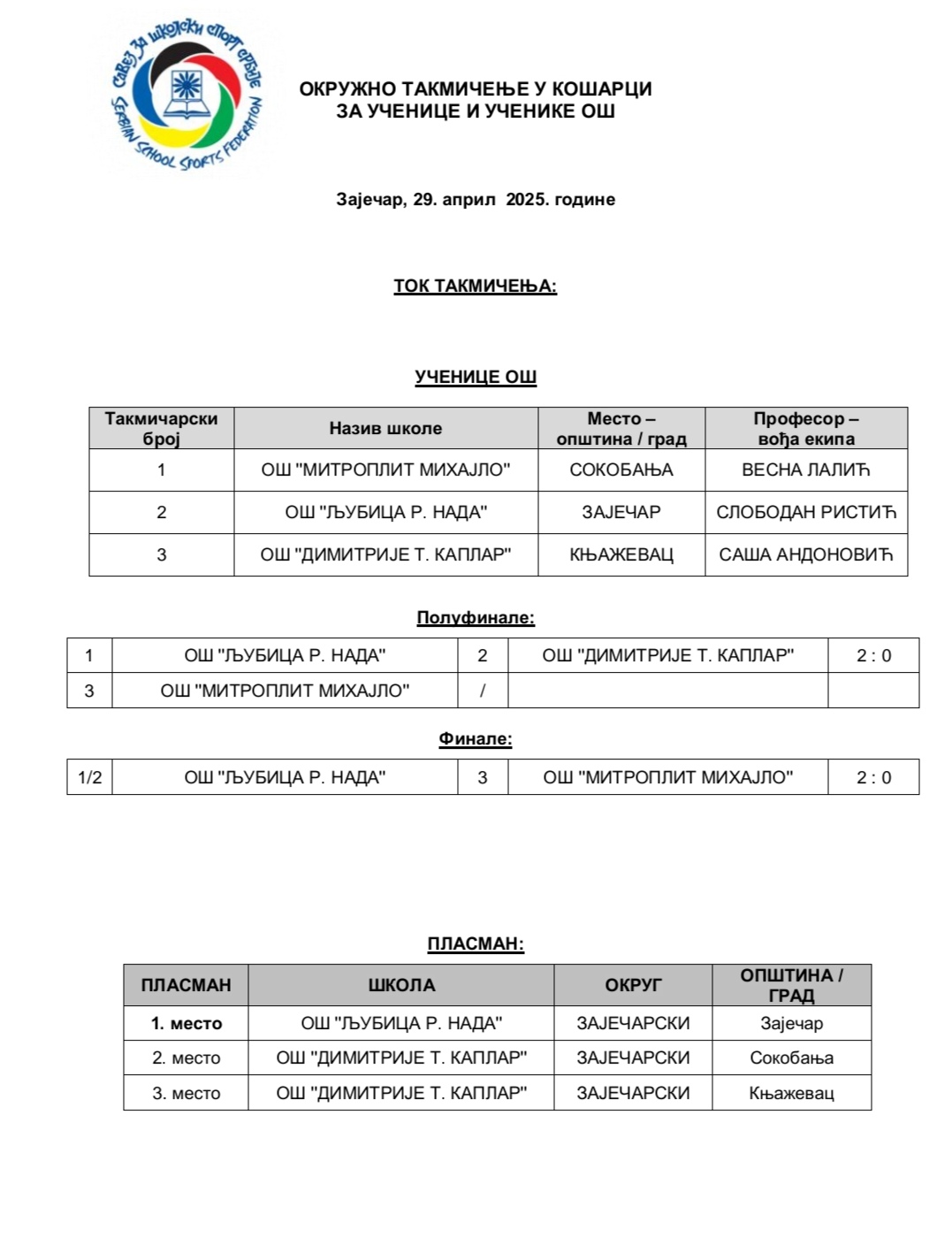 „Глас спорта је испратио и Окружно такмичење са лица места, није било много дилема око победника, а ево и свих резултата са утакмица одиграних у сали ОШ „Љубица Радосављевић Нада“ у уторак 29. априла: