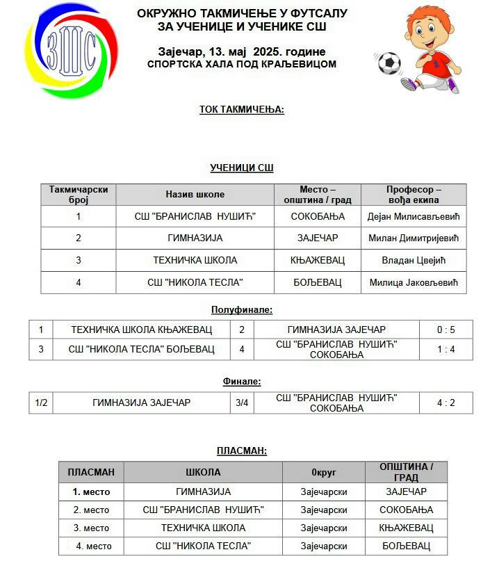 Гимназија у мушкој и Медицинска школа у женској конкуренцији показале су да Зајечарцима нема премца у футсалу на територији Зајечарског управног округа. Наиме, ове две екипе освојиле су 1. места на Окружном такмичењу одржаном у уторак 13. маја у хали спортова на Краљевици.