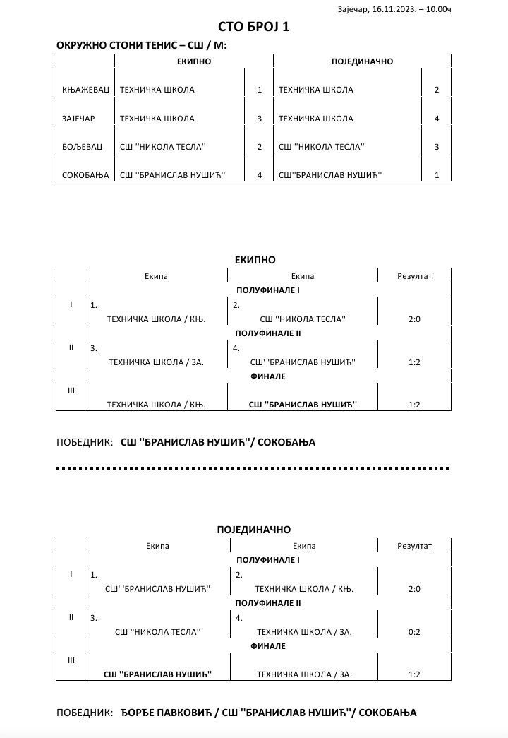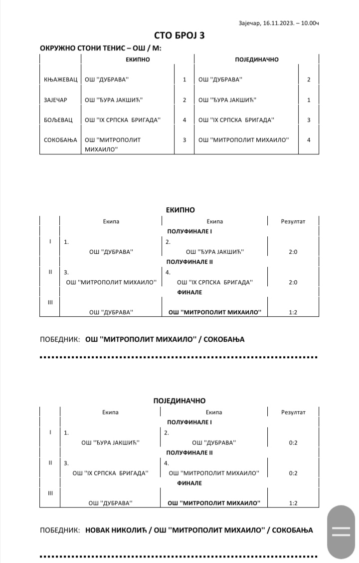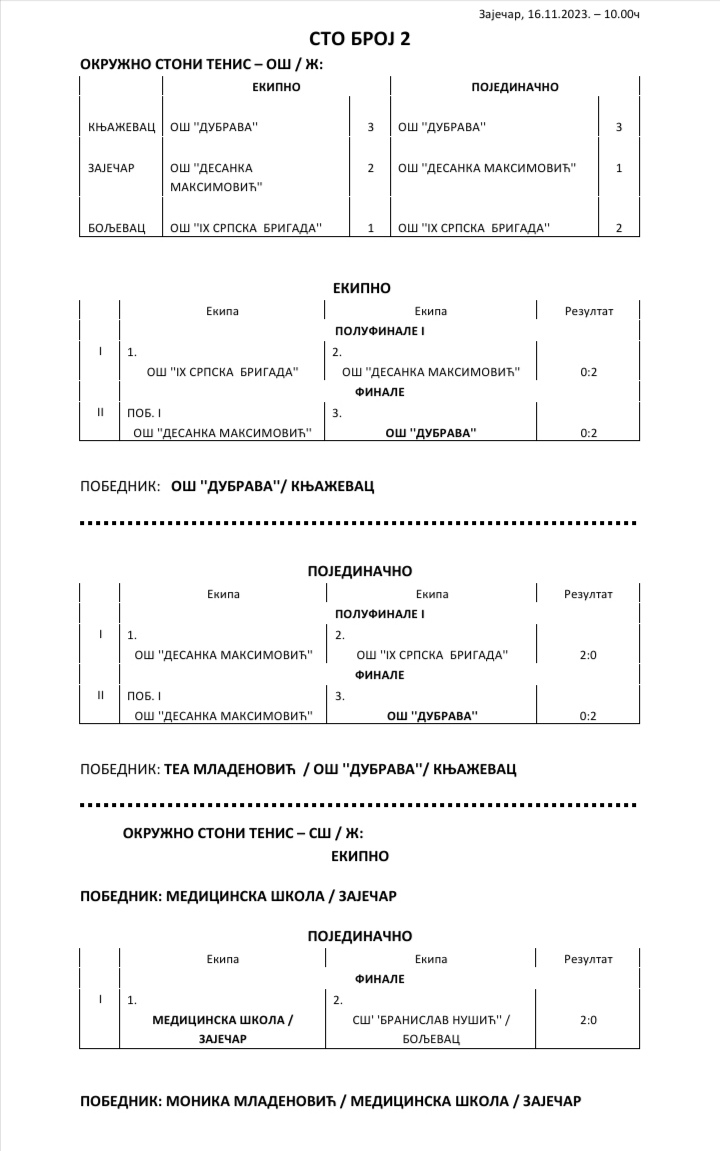 Окружно такмичење у стоном тенису за ученике основних и средњих школа, одржано је у четвртак 16. новембра у Зајечару. Домаћин надметања у организацији Зајечарског савеза за школски спорт (ЗШС) била је Техничка школа, а велику подршку у организацији пружио је Стонотениски клуб „Тимок“, чији су чланови делили правду на такмичењу са кога су најуспешније екипе и појединци изборили пласман на Олимпијаду у Новом Саду, која је према плану и програму Савеза за школски спорт Србије предвиђена за мај 2024. године.