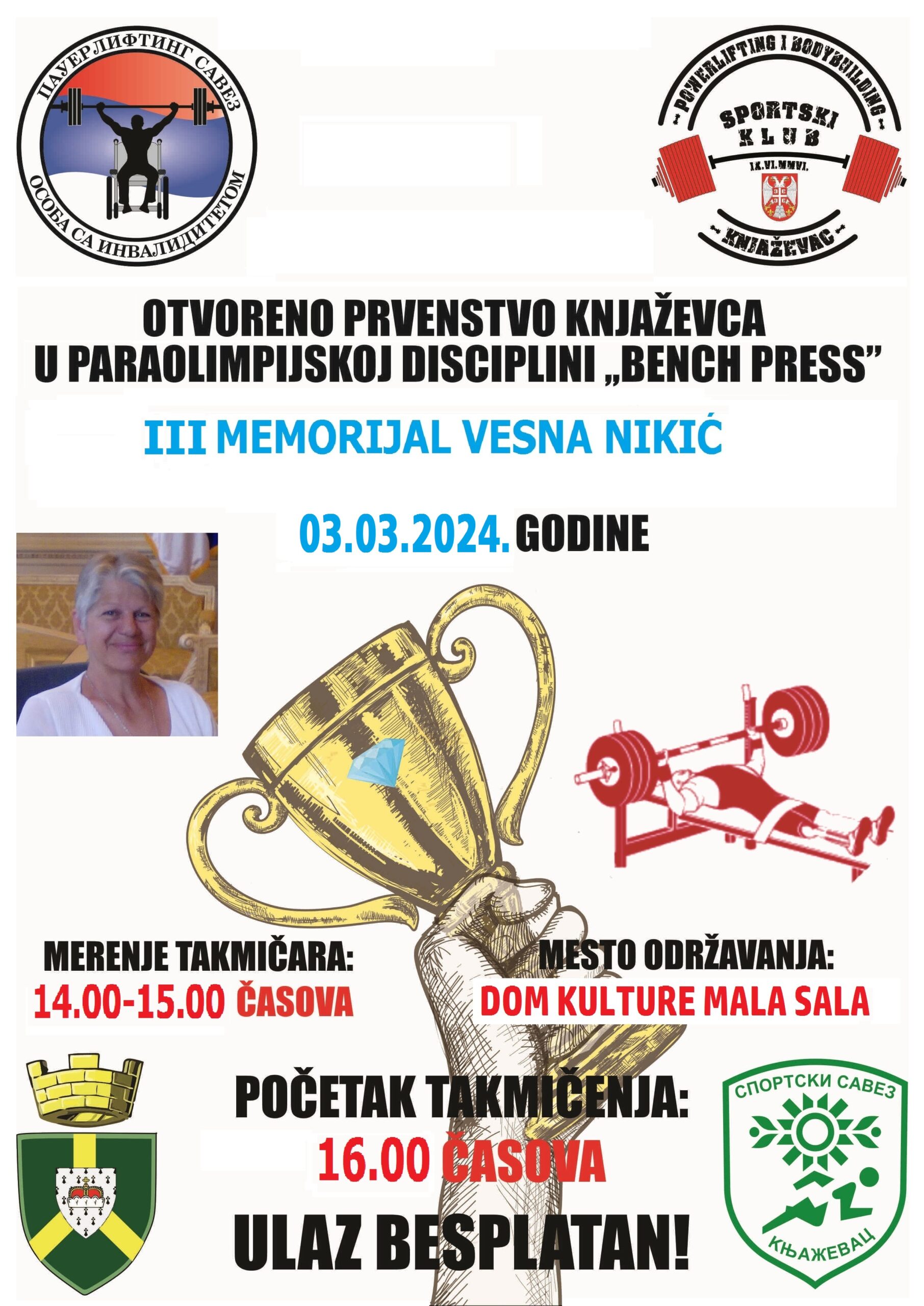 ОТВОРЕНО ПРВЕНСТВО СРБИЈЕ У „BENCH PRESS-U“ И МЕМОРИЈАЛ „ВЕСНА НИКИЋ“ ЗА ВИКЕНД У КЊАЖЕВЦУ