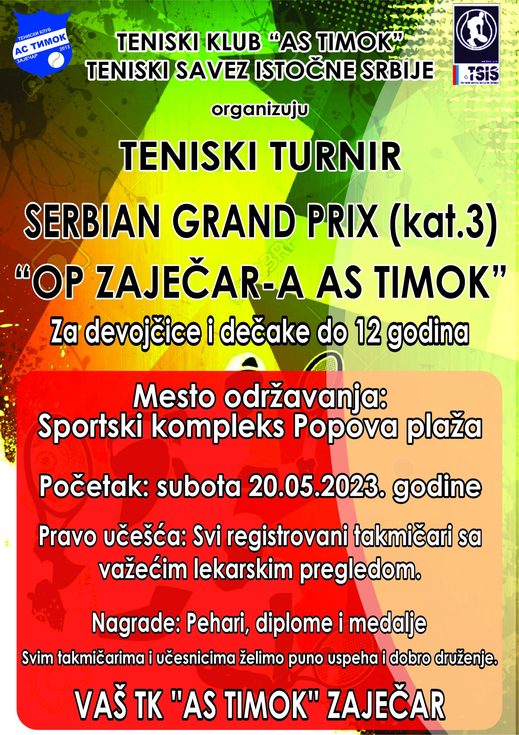 Отворено првенство Зајечара у тенису у конкуренцији играча до 12 година „Serbian Grand prix“ на програму је 20. маја на теренима Спортско-рекреативног центра „Попова“ плажа“. Организатор турнира III категорије из календара Тениског савеза источне Србије je TK „АС Тимок“, a право учешћа имају регистровани такмичари Тениског савеза Србије.