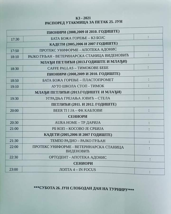 Петак је резервисан за решење дилема у групној фази млађих категорија, а посебно занимљиво биће у конкуренцији кадета, играча рођених 2005. године и млађих, који ће у пет мечева данашњег програма имати прилику да покажу своје умеће. „Глас спорта“ наставља да прат сва дешавања са турнира, а петог дана нас очекују следећи мечеви, с разликом да ће „Пластопромет – Бата Божа Горење“ у пионирској и „ИН Фокус“ – „Лопта 4“ бити одигране другом приликом.