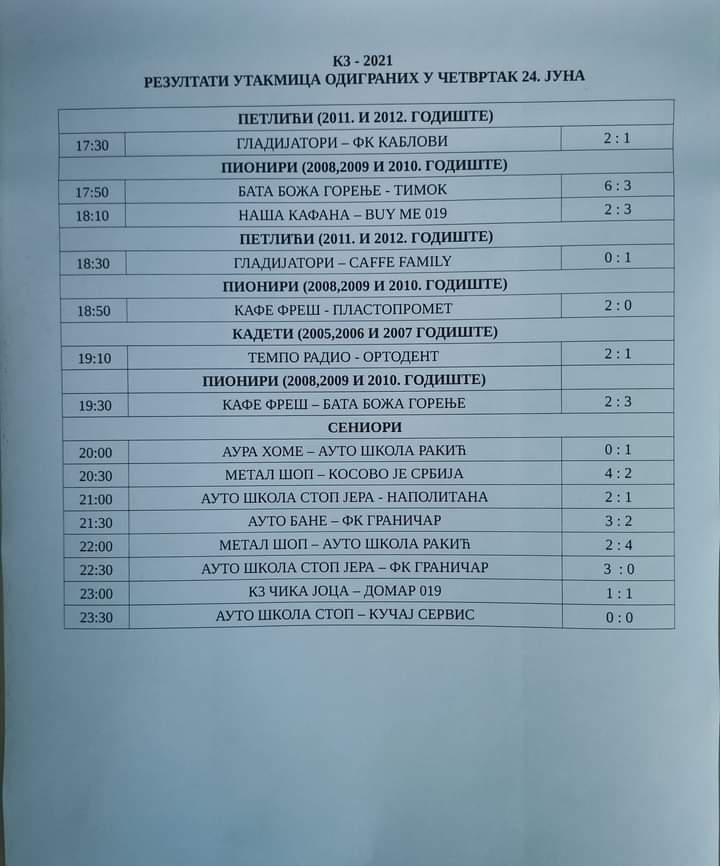 Меморијални турнир у Котлујевцу из дана у дан привлачи све више публике на терен у насељу „Кључ“. Поготово је то било видљиво четвртог дана такмичења, када су се на терену нашли и домаћи играчи, из редова екипе „К3 Чика Јоца“, који су и једни од организатора турнира. Ево и свих резултата: